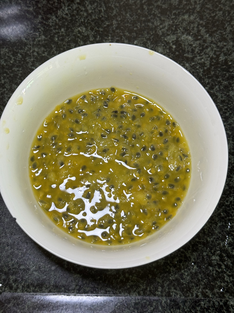 Next, prepare your fruit. Cut the passion fruits in half and use a spoon to scoop all the glorious pulp, juice, and seeds into a small bowl.