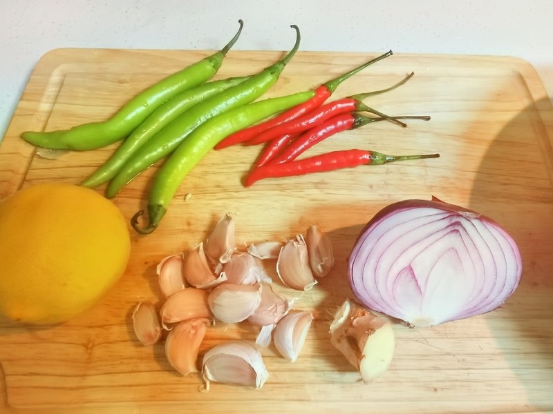 Chop your onion, bird’s eye chilies, and hot green peppers. Mince the ginger and garlic cloves.
