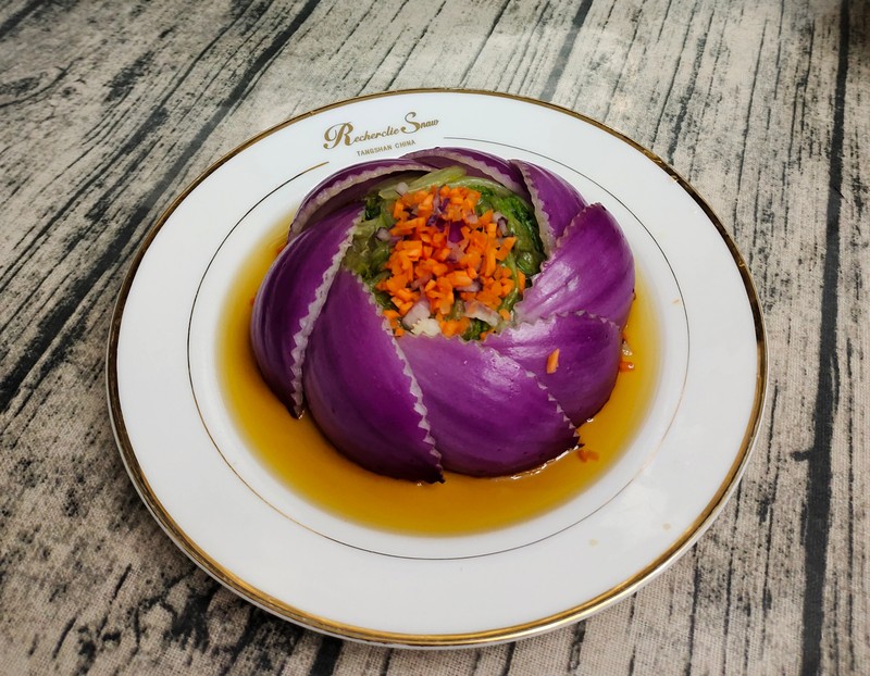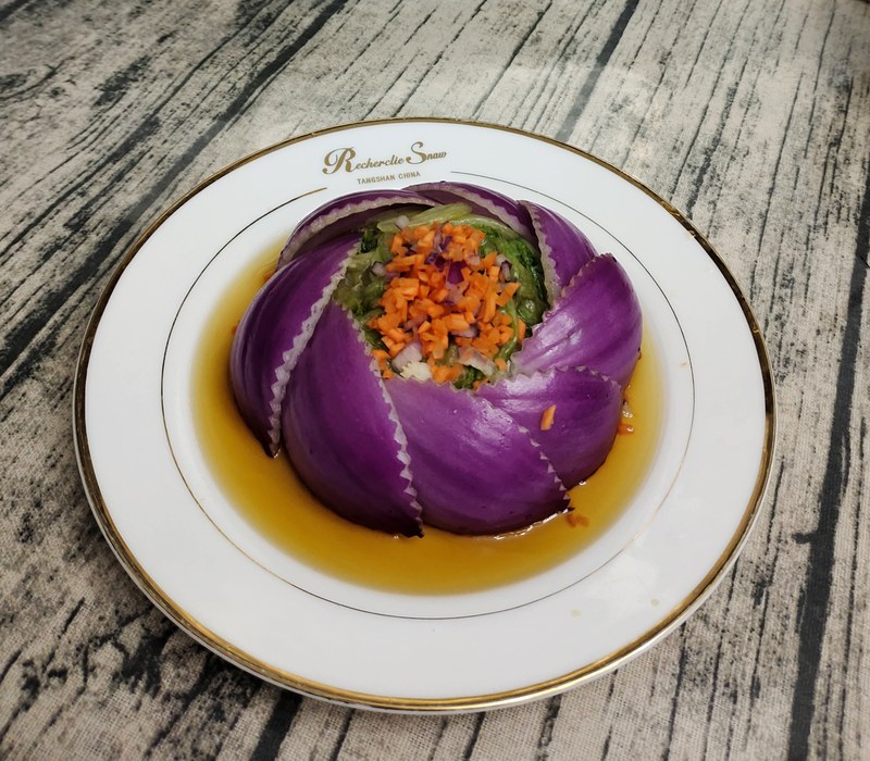 In a larger bowl, toss the thoroughly drained lettuce with the prepared dressing until every piece is lightly coated. Now for the presentation! For a beautiful, domed shape, pack the dressed lettuce firmly into a small serving bowl. Place your serving plate upside down over the top of the bowl, and in one swift motion, flip them over together. Lift the bowl off to reveal a perfect mound of salad. To finish, artfully arrange your garnishes. Thinly slice the red onion, or for a fancier touch, use a small, sharp knife or specialty scissors to cut decorative floral shapes. Scatter the red onion around the base of the lettuce mound and sprinkle the finely minced carrot over the top for a final splash of color. Voilà!