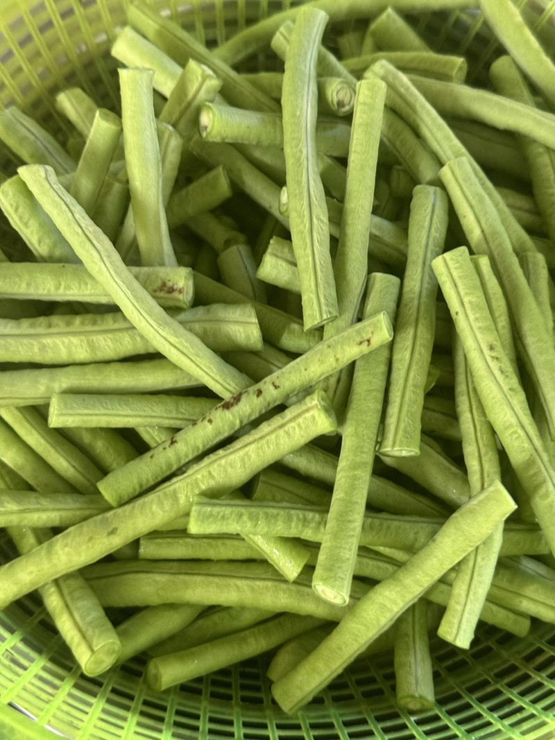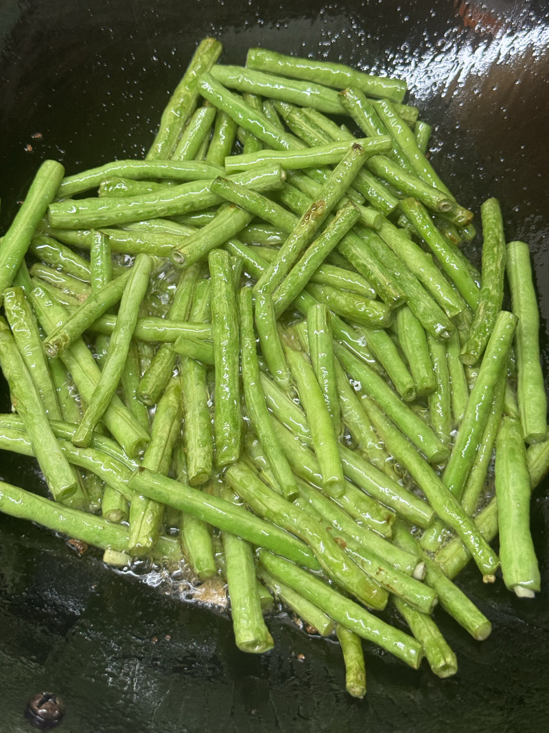 4. Add another tablespoon of oil to the same pot. Add the green beans and stir-fry for 1-2 minutes until they turn bright green and are slightly blistered. Remove and set aside with the potatoes.