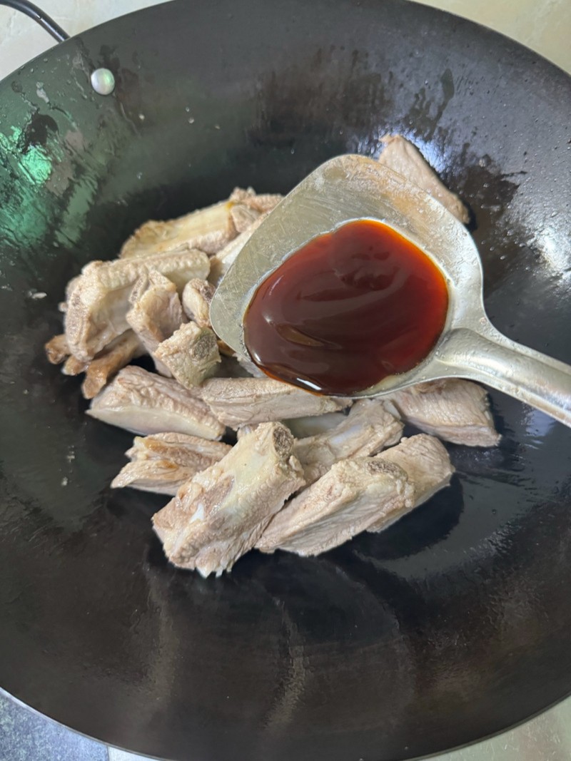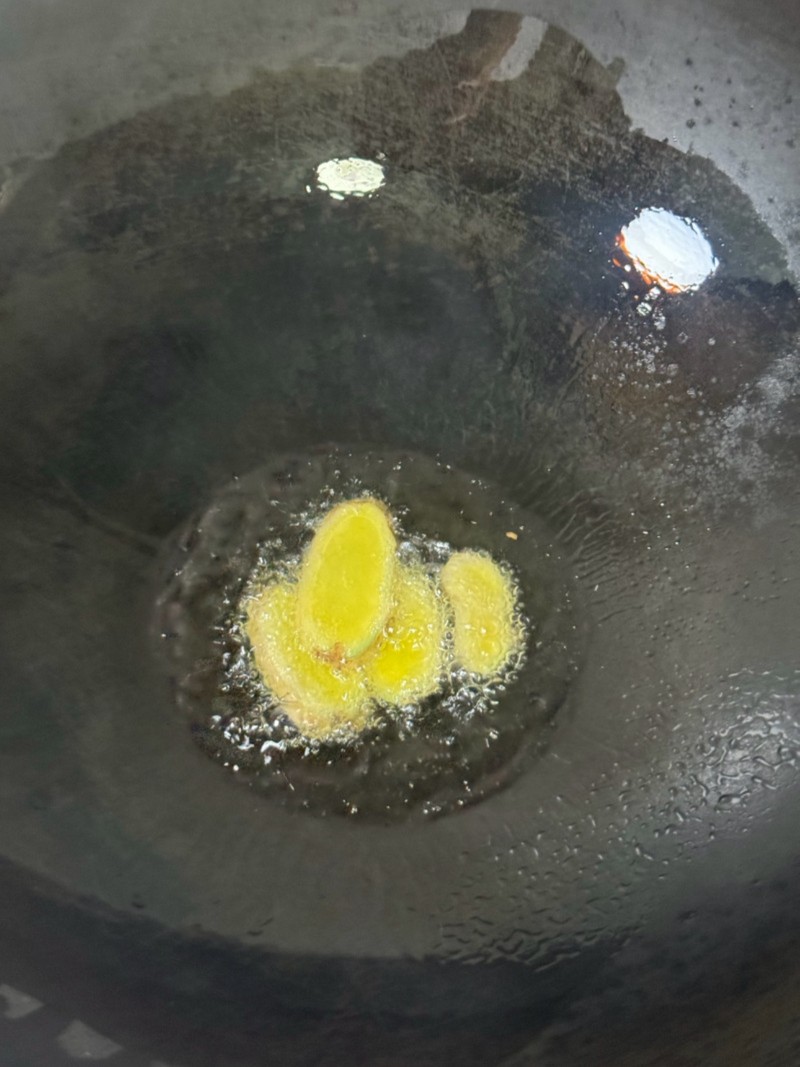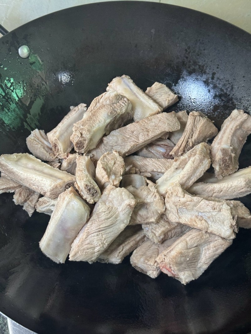 5. Add the final tablespoon of oil to the pot. Add the sliced ginger and stir-fry for about 30 seconds until fragrant. Add the blanched pork ribs and toss them in the hot oil for 2-3 minutes until they are lightly browned.