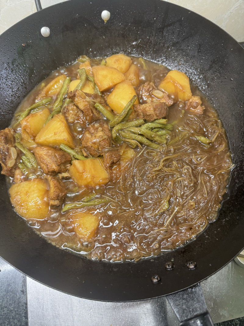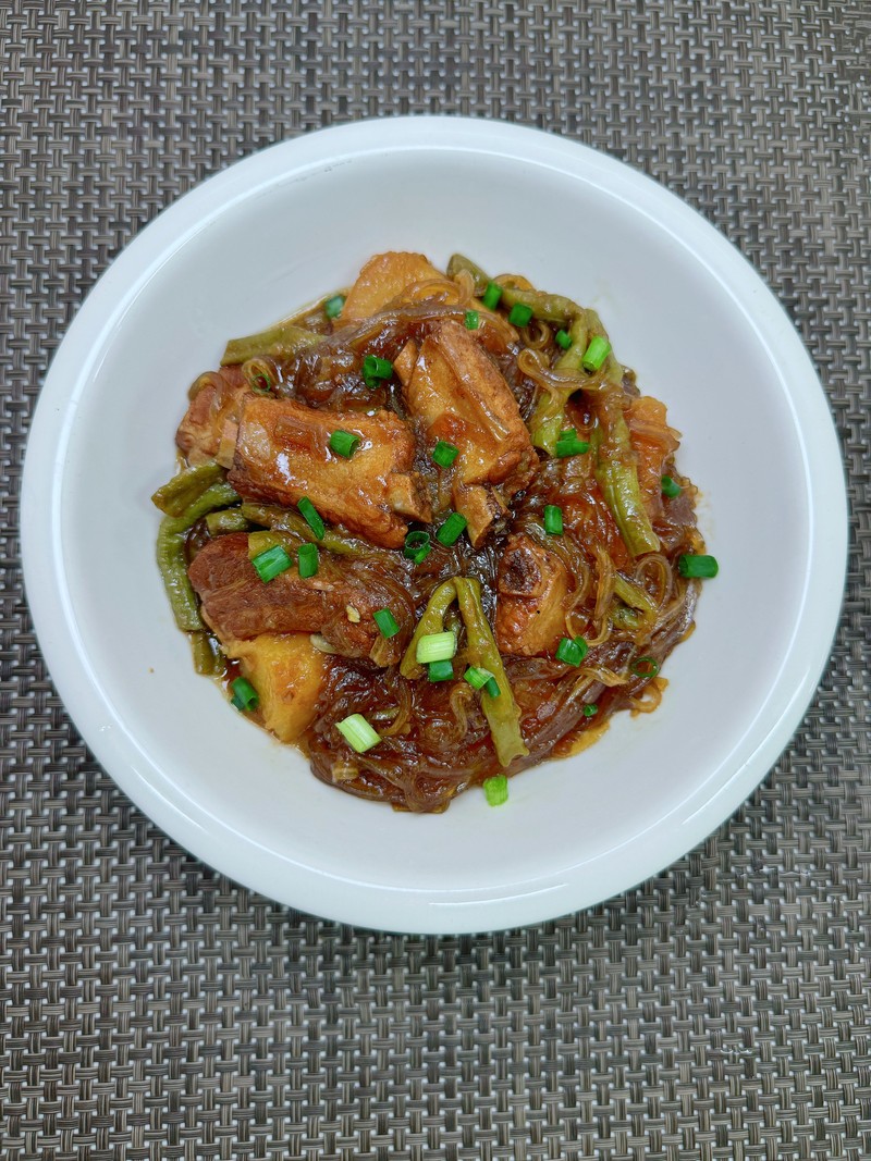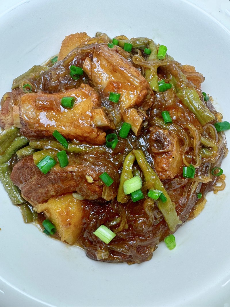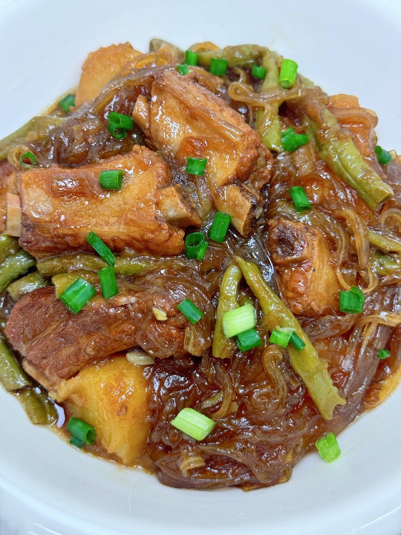 Tags: chopped scallions · dark soy sauce · ginger · green beans · home cooking · hot dishes · light soy sauce · oyster sauce · peanut oil · potato · pressure cooker · salt · spare ribs · vermicelli · wok