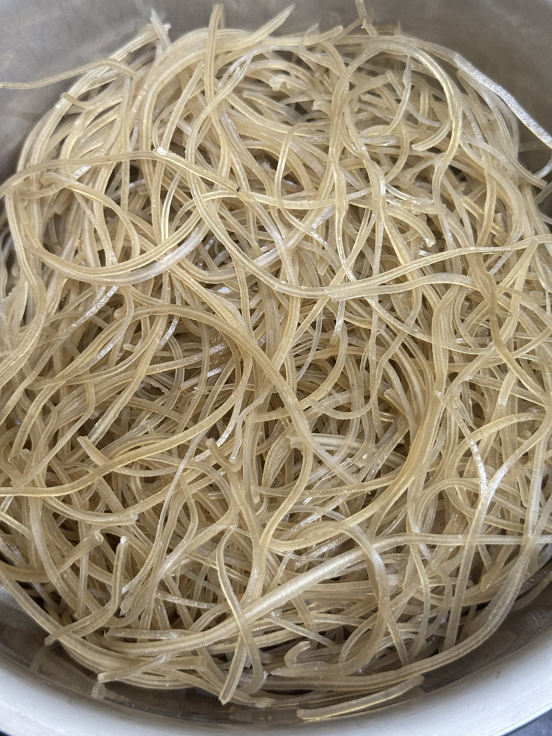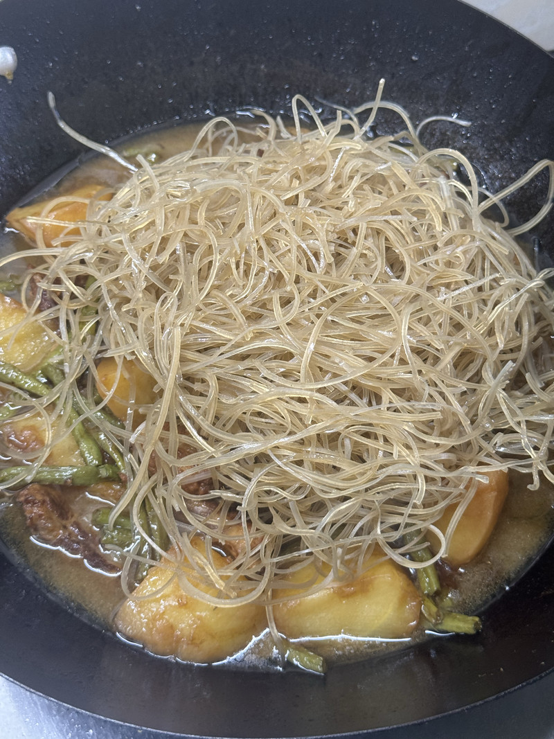 10. Drain the softened glass noodles and add them to the stew. They only need 2-3 minutes to cook. Stir them in and let the stew bubble away on high heat. The starch from the noodles and potatoes will help thicken the sauce beautifully.