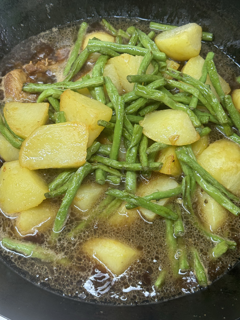9. Add the pre-fried potatoes and green beans to the pot. Stir gently, cover, and let everything simmer together for about 5-7 minutes, until the vegetables are cooked through but not mushy.