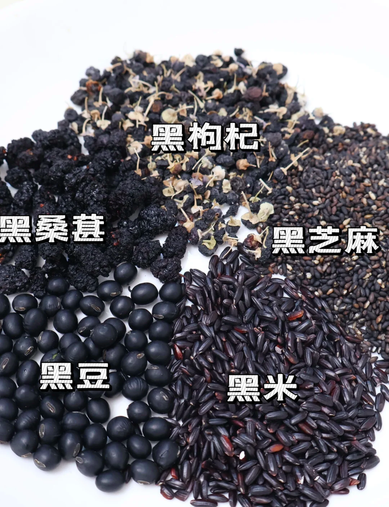 1. Gather your five black ingredients: black goji berries, black beans, black rice, black mulberries, and black sesame seeds.